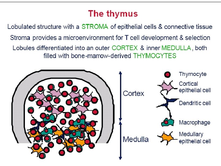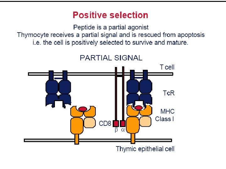 Positive Selection • Takes place in the cortical region of the thymus & involves the interaction of immature thymocytes with cortical epithelial cells. • Permits the survival of only those T cells whose TCRs recognize self-MHC mol. • Responsible for the creation of a self-MHC restricted repertoire of T cells.
