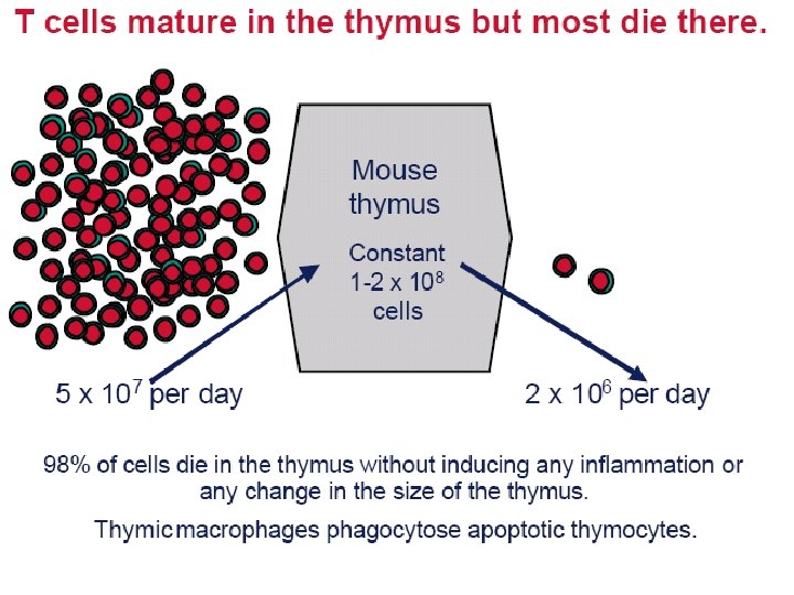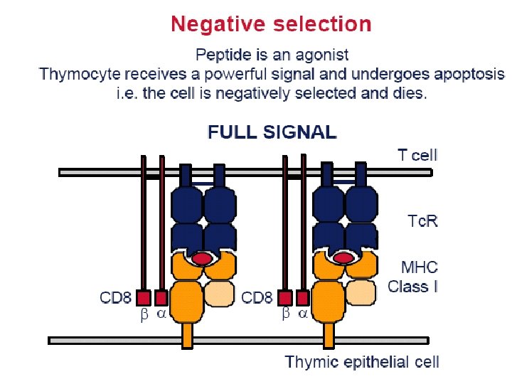 Negative Selection • Eliminates T cells that react with self-MHC or with self-MHC plus self peptides, in medulla. • Generates a primary T-cell repertoire that is self-tolerant.