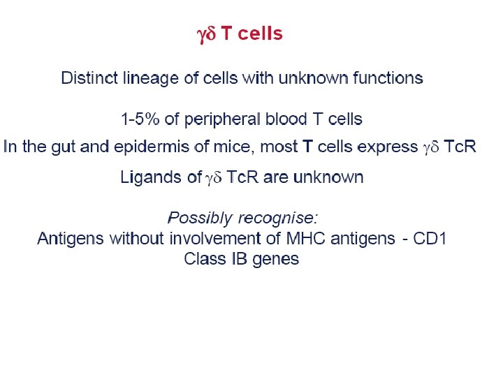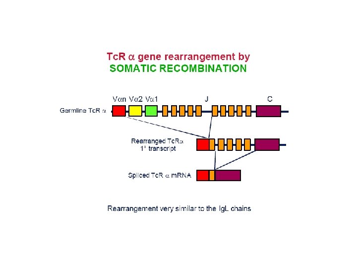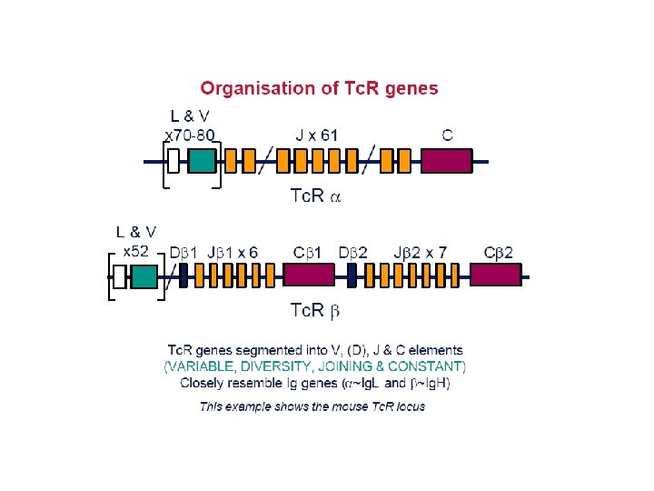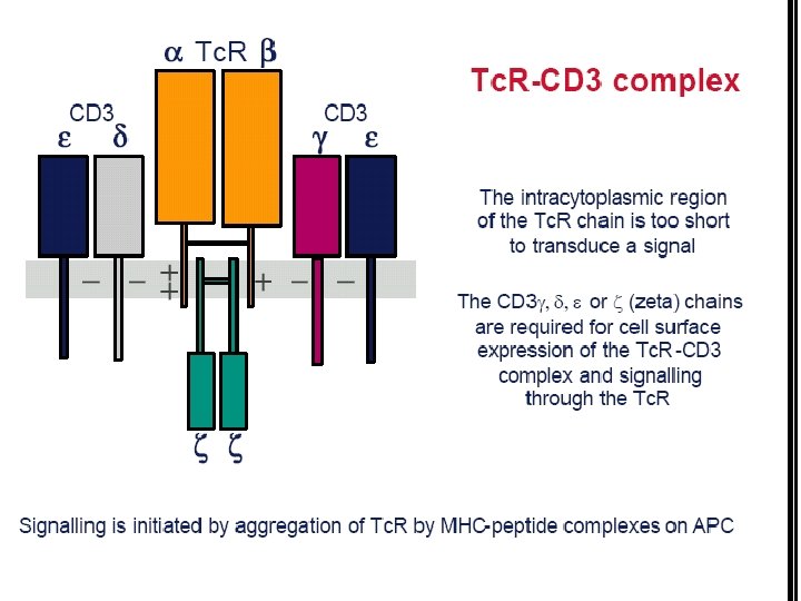 TCR • TCR chains organised into variable & constant domains’ • V regions contain 3 hypervariable CDRs. • Each chain also contains a short membraneproximal connecting region, a hydrophobic transmembrane segment & a short cytoplasmic tail.