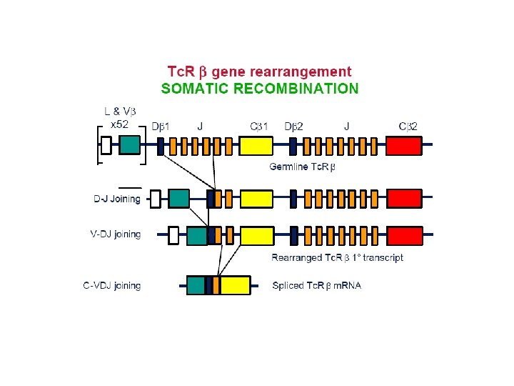 T cell development • Most DN stop proliferating & begin to rearrange TCR chain genes & express chain. • Newly synthesized chain combine with a 33 Kda glycoprotein known as pre-T chain & associate with cd 3 group to form Pre-TCR. • Signal transmitted through Pre-TCR, induced expression of both cd 4 & cd 8 DP(double-positive) cells • 98% of thymocytes die either because of failure in TCR rearrangement or thymic selection.