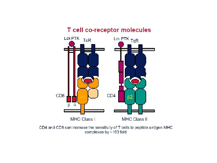 Co-receptors • CD 4 & CD 8 bind to the membraneproximal domains of MHC molecules thus strengthening the relatively weak interaction between the T cell receptor & peptide-MHC complex. • Also participate in signal transduction via long cytoplasmic tails.