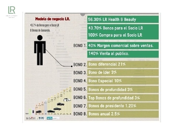 Promocionando y consumiendo Producto Ejemplo: 10 Pack a 10 amigos. 1. Por cada producto que promocionas ganas siempre un 40% de todo el catálogo LR, más bonificaciones. . 2. Además para tu consumo por ser socio, te ahorras un 40% de todos los productos LR. 98€ uni 3. Nadie te obliga a comprar productos cada mes, compras por que te gusta usarlos o por que lo promocionas. 980 € PVP 12. 000 puntos = 21% Bonif. 8. 000 puntos = 16% Bonif. 40% Margen comercial 4. Puedes pagar de tres formas distintas( tarjeta de Crédito, contra reembolso y transferencia bancaria). Tabla de bonificación 4. 000 puntos = 14% Bonif. 2. 000 puntos = 11% Bonif. 1. 000 puntos = 9% Bonif. 5. 60 días de derecho de devolución. 700 € Precio de Asesor 6. Entrega inmediata de 24 h a 72 h. . 7. Transporte a la puerta de tu casa gratuito. 500 puntos = 6% Bonif. 250 puntos = 3% Bonif. 8. Pedido mínimo de 50 € a precio de socio. Ganancia del Asesor LR Precio de compra Cliente = 980 € Precio de compra Socio = 700 € 40% margen (500 € VN) 1 € VN = ca 2 puntos = 280 € + 9% Bonif. sobre 500 € VN = 45 € Ganancia = 325 € El valor neto se calcula restando , al precio del asesor los impuestas como IVA y otros impuestos directos, en total un 40%
