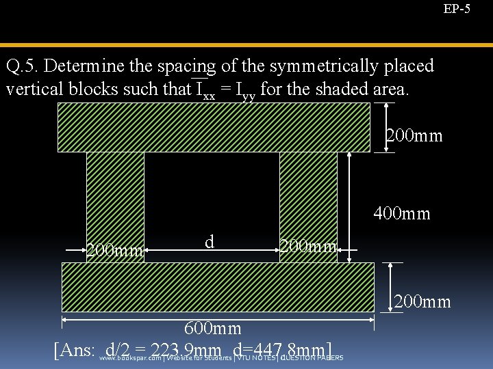 EP-5 Q. 5. Determine the spacing of the symmetrically placed vertical blocks such that Ixx = Iyy for the shaded area. 200 mm 400 mm 200 mm d 200 mm 600 mm [Ans: d/2 = 223. 9 mm d=447. 8 mm] www. bookspar. com | Website for Students | VTU NOTES | QUESTION PAPERS