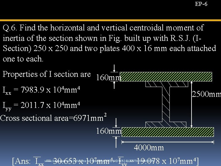 EP-6 Q. 6. Find the horizontal and vertical centroidal moment of inertia of the section shown in Fig. built up with R. S. J. (ISection) 250 x 250 and two plates 400 x 16 mm each attached one to each. Properties of I section are 160 mm Ixx = 7983. 9 x 104 mm 4 2500 mm Iyy = 2011. 7 x 104 mm 4 2 Cross sectional area=6971 mm 160 mm 4000 mm [Ans: I = 30. 653 x 107 mm 4, I = 19. 078 x 107 mm 4] www. bookspar. com | Website for Students | VTU NOTES | QUESTION PAPERS