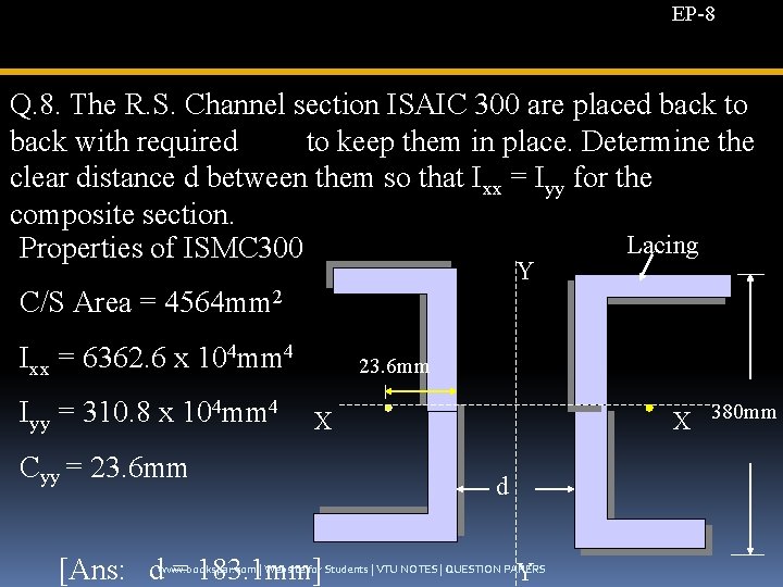 EP-8 Q. 8. The R. S. Channel section ISAIC 300 are placed back to back with required to keep them in place. Determine the clear distance d between them so that Ixx = Iyy for the composite section. Lacing Properties of ISMC 300 Y C/S Area = 4564 mm 2 Ixx = 6362. 6 x 104 mm 4 Iyy = 310. 8 x 104 mm 4 23. 6 mm X 380 mm X Cyy = 23. 6 mm [Ans: d = 183. 1 mm] d Y www. bookspar. com | Website for Students | VTU NOTES | QUESTION PAPERS