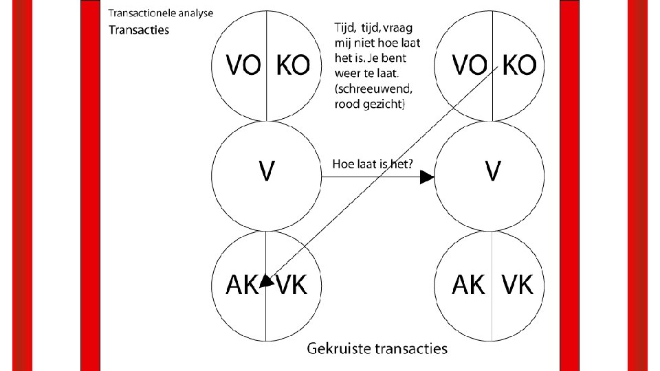 Een complementaire transactie is een transactie waarbij de vectoren parallel lopen aan elkaar en waarbij de stimulus en respons gericht zijn op de identieke ego-posities O – O transacties V – V transacties K – K transacties O – K transacties K – O transacties 1 ste regel: Complementaire transacties kunnen tot in de oneindigheid doorgaan.