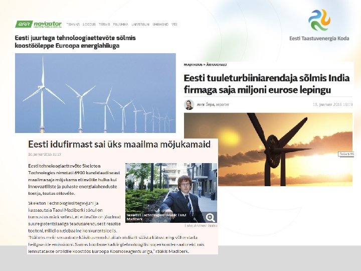 Taastuvenergia tugevaid kasvusektoreid 1. Heitmete vähendamiseks on suurriigid USA, Hiina, Saksamaa, Jaapan, India teinud panuse taastuvenergiale. 2. Pariisi kliimalepe annab tohutu hoo keskkonnatehnoloogiate arengule aga ka traditsiooniliste majandusharude ümberkorraldamisele. Puhastesse energiatehnoloogiatesse investeeritakse järgmise 15 aasta jooksul 13, 5 triljonit dollarit (IEA). 3. Läbimõeldud riiklik lähenemine partnerluses erasektoriga aitaks ka Eestil sellest osa saada. Eestis arendatakse ja toodetakse edukalt tuulikuid, päikesepaneele, invertereid, targa maja seadmeid, tarkvaralahendusi jpt. Sektoris tegutseb üle 40 tehnoloogiat arendava ettevõtte.