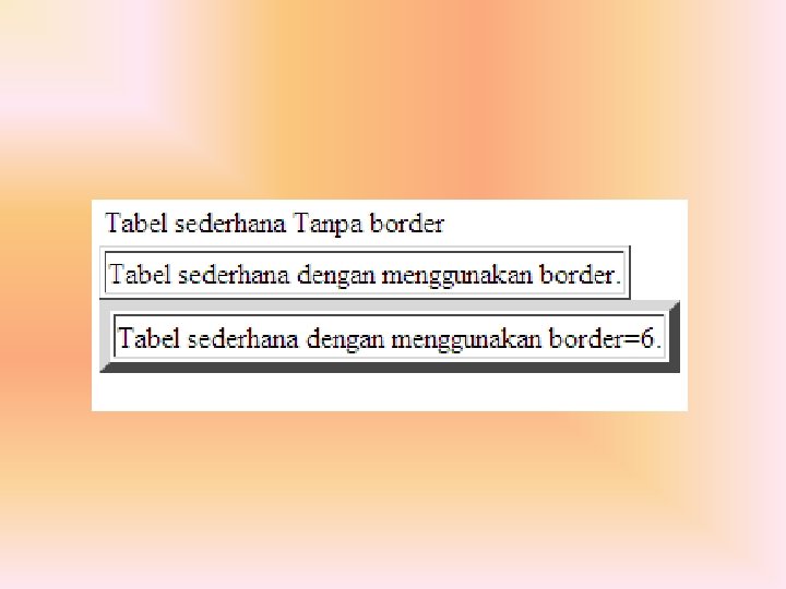 Tabel Sederhana • Untuk membuat suatu tabel minimal diperlukan tiga elemen tabel. Tag TABLE digunakan sebagai awal pembuatan tabel, tag TR digunakan untuk mendifinisikan berapa banyak baris pada tabel, dan tag TD digunakan untuk menampung sel data dari tabel tersebut. • • • <table> <tr> <td>Tabel sederhana Tanpa border</td> </tr> </table> • • • Untuk membuat garis batas, dapat ditambahkan dengan atribut border seperti berikut <table border=1> <tr> <td>Tabel sederhana dengan menggunakan border. </td> </tr> </table> • • • Lebar dari border dapat diatur dengan memberikan nilai pada atribut tersebut <table border=6> <tr> <td>Tabel sederhana dengan menggunakan border=6. </td> </tr> </table>