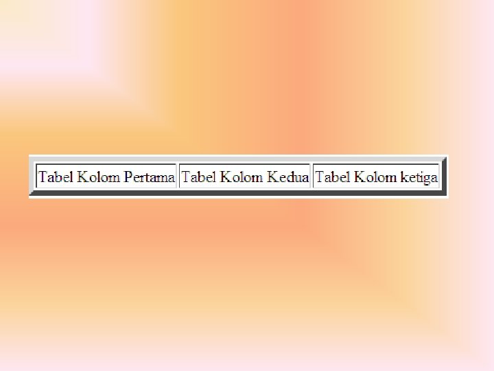 …. . <TABLE BORDER=“ 5”> <TR> <TD>Tabel Kolom Pertama </TD> <TD>Tabel Kolom Kedua </TD> <TD>Tabel Kolom ketiga </TD> </TR> </TABLE> …. .