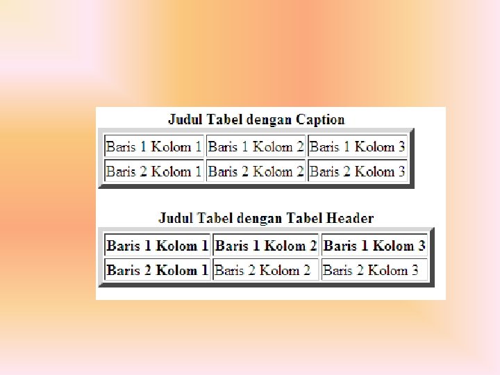 • • • • • • • <table border=5> <caption><b>Judul Tabel dengan Caption</b></caption> <tr> <td>Baris 1 Kolom 1 </td> <td>Baris 1 Kolom 2 </td> <td>Baris 1 Kolom 3 </td> </tr> <td>Baris 2 Kolom 1 </td> <td>Baris 2 Kolom 2 </td> <td>Baris 2 Kolom 3 </td> </tr> </table> <table border=5> <caption><b>Judul Tabel dengan Tabel Header</b></caption> <tr> <th>Baris 1 Kolom 1 </th> <th>Baris 1 Kolom 2 </th> <th>Baris 1 Kolom 3 </th> </tr> <th>Baris 2 Kolom 1 </th> <td>Baris 2 Kolom 2 </td> <td>Baris 2 Kolom 3 </td> </tr> </table>