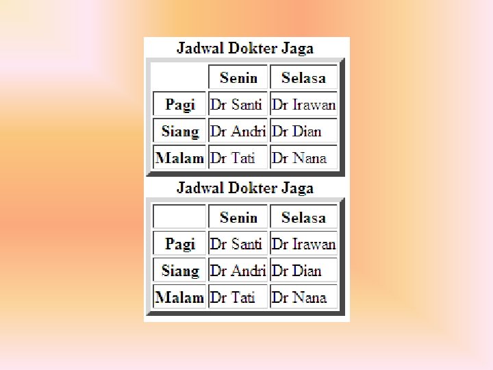 Mengatur Spasi Tabel • Atribut yang digunakan untuk mengatur spasi dalam tabel yaitu CELLSPACING dan CELLPADDING. • CELLSPACING digunakan untuk menentukan jumlah spasi yang terdapat diantara dua buah sel dalam sebuah tabel, sedangkan • CELLPADDING digunakan untuk menentukan jumlah spasi yang terdapat diantara border sel dan dengan isi yang ada didalam sel tersebut. Berikut adalah contoh tabel yang menggunakan perintah cellpadding dan celspacing.