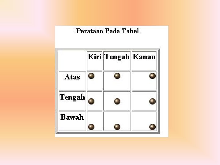 • • • • • • • • contoh perataan tabel dengan menggunakan perintah ALIGN dan VALIGN. <table border=5> <caption><h 4> Perataan Pada Tabel</h 4> </caption> <tr> <td></td> <th><h 3>Kiri </h 3></th> <th><h 3>Tengah</h 3></th> <th><h 3>Kanan </h 3></th> </tr> <th><h 3>Atas </h 3></th> <td align=”left” valign=”top”><img border=” 0″ src=”bola. GIF” width=” 15″ height=” 15″></td> <td align=”center” valign=”top”><img border=” 0″ src=”bola. GIF” width=” 15″ height=” 15″></td> <td align=”right” valign=”top”><img border=” 0″ src=”bola. GIF” width=” 15″ height=” 15″></td> </tr> <th><h 3>Tengah </h 3></th> <td align=”left” valign=”middle”><img border=” 0″ src=”bola. GIF” width=” 15″ height=” 15″></td> <td align=”center” valign=”middle”><img border=” 0″ src=”bola. GIF” width=” 15″ height=” 15″></td> <td align=”right” valign=”middle”><img border=” 0″ src=”bola. GIF” width=” 15″ height=” 15″></td> </tr> <th><h 3>Bawah </h 3></th> <td align=”left” valign=”bottom”><img border=” 0″ src=”bola. GIF” width=” 15″ height=” 15″></td> <td align=”center” valign=”bottom”><img border=” 0″ src=”bola. GIF” width=” 15″ height=” 15″></td> <td align=”right” valign=”bottom”><img border=” 0″ src=”bola. GIF” width=” 15″ height=” 15″></td> </tr> </table>
