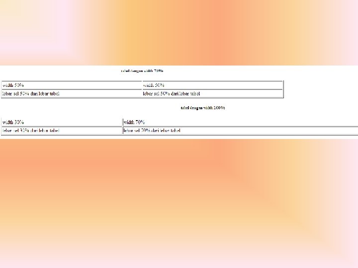 • • • • • • <table border=1 width=” 70%”> <caption align=”bottom”> <h 5> tabel dengan width 70%</h 5> </caption> <tr> <td width=” 50%”>width 50%</td> </tr> <td>lebar sel 50% dari lebar tabel</td> </tr> </table> <table border=1 width=” 100%”> <caption align=”bottom”> <h 5> tabel dengan width 100%</h 5> </caption> <tr> <td width=” 30%”>width 30%</td> <td width=” 70%”>width 70%</td> </tr> <td>lebar sel 30% dari lebar tabel</td> <td>lebar sel 70% dari lebar tabel</td> </tr> </table>