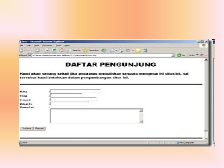 • • • Contoh pembuatan form <HTML> <HEAD> <TITLE>Contoh Membuat Form</TITLE></HEAD> <BODY> <H 1 ALIGN=”CENTER”>FORM PENDAFTARAN ONLINE</H 1> <HR size=3 color=”black”> <FORM METHOD=”POST” ACTION=”contohform. htm”> <TABLE> • • • • • • • • • • <TR> <TD><B>Nama : </B></TD> <TD><INPUT TYPE=”Text” NAME=”var. Nama” SIZE=” 15″></TD> </TR> <TD><B>Alamat : </B></TD> <TD><INPUT TYPE=”Text” NAME=”var. Alamat” SIZE=” 30″></TD> </TR> <TD><B>Agama : </B></TD> <TD><SELECT NAME=”agama” SIZE=” 1″> <OPTION>Islam</OPTION> <OPTION>Kristen</OPTION> <OPTION>Budha</OPTION> <OPTION>Hindu</OPTION> </SELECT> </TD> </TR> <TD><B>Password : </B></TD> <TD><INPUT TYPE=”Password” NAME=”var. Password” SIZE=” 10″></TD> </TR> </TABLE> <B>Jenis kelamin: </B><INPUT CHECKED TYPE=”Radio” NAME=”Kelamin” VALUE=”Pria”>Pria <INPUT TYPE=”Radio” NAME=”Kelamin” VALUE=”Wanita”>Wanita <BR> <B>Hobi: </B><BR> <INPUT TYPE=”Checkbox” NAME=”Kelamin” VALUE=”Soccer”>Sepakbola <INPUT CHECKED TYPE=”Checkbox” NAME=”Hobi” VALUE=”Badminton”>Bulutangkis <INPUT TYPE=”Checkbox” NAME=”Hobi” VALUE=”Computer”>Komputer <BR> <INPUT TYPE=”Checkbox” NAME=”Hobi” VALUE=”Game”>Permainan video <INPUT CHECKED TYPE=”Checkbox” NAME=”Hobi” VALUE=”Internet”>Internet <BR> <B>Komentar</B><BR> <TEXTAREA Cols=” 30″ Rows=” 5″ Name=”komentar”></TEXTAREA><BR> <INPUT TYPE=”Submit” VALUE=”Send info”> <INPUT TYPE=”Reset” VALUE=”Clear form”> </FORM> </BODY> </HTML>