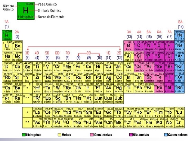 Nome das Famílias Família IA – Metais Alcalinos Família IIA – Metais Alcalinos Terrosos Família IIIA – Família do Boro Família IVA – Família do Carbono Família VA – Família do Nitrogênio Família VIA – Calcogênios Família VIIA – Halogênios Família VIIIA – Gases Nobres
