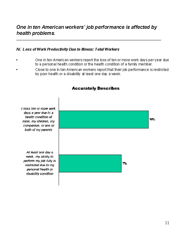 One in ten American workers’ job performance is affected by health problems. IV. Loss of Work Productivity Due to Illness: Total Workers • • One in ten American workers report the loss of ten or more work days per year due to a personal health condition or the health condition of a family member. Close to one in ten American workers report that their job performance is restricted by poor health or a disability at least one day a week. 11