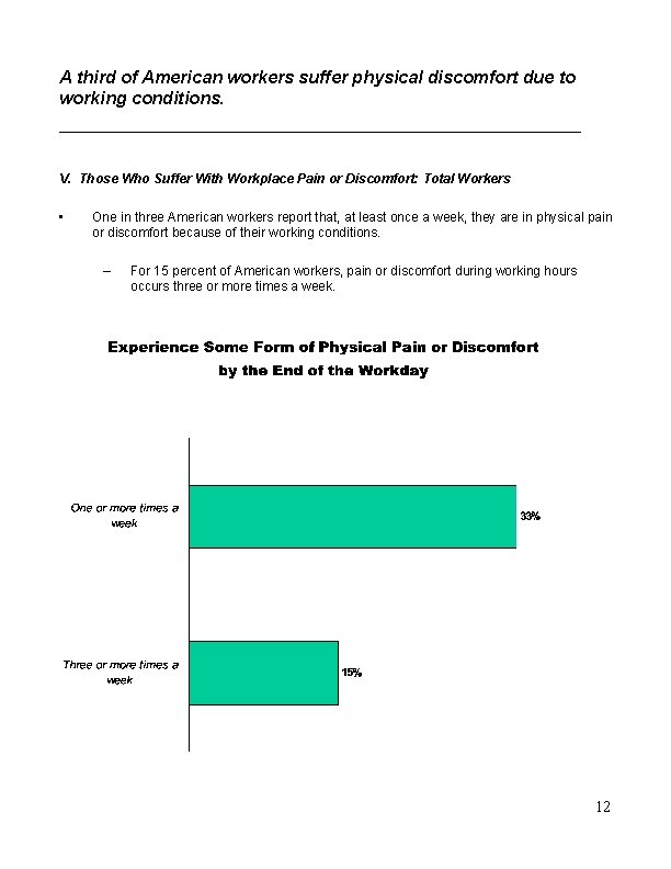 A third of American workers suffer physical discomfort due to working conditions. V. Those Who Suffer With Workplace Pain or Discomfort: Total Workers • One in three American workers report that, at least once a week, they are in physical pain or discomfort because of their working conditions. – For 15 percent of American workers, pain or discomfort during working hours occurs three or more times a week. 12