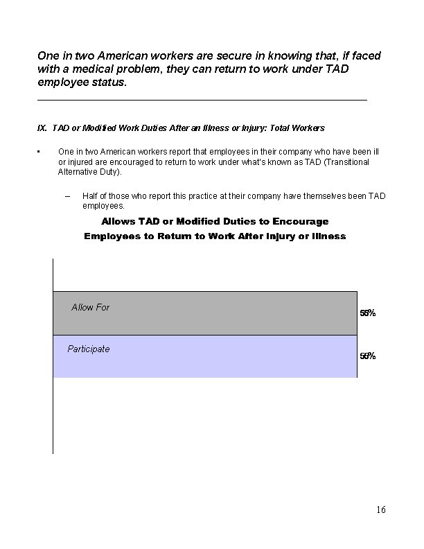 One in two American workers are secure in knowing that, if faced with a medical problem, they can return to work under TAD employee status. IX. TAD or Modified Work Duties After an Illness or Injury: Total Workers • One in two American workers report that employees in their company who have been ill or injured are encouraged to return to work under what’s known as TAD (Transitional Alternative Duty). – Half of those who report this practice at their company have themselves been TAD employees. Allow For Participate 16