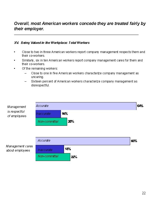 Overall, most American workers concede they are treated fairly by their employer. XV. Being Valued in the Workplace: Total Workers • • • Close to two in three American workers report company management respects them and their co-workers. Similarly, six in ten American workers report company management cares for them and their co-workers. Of the remaining workers: – Close to one in five American workers characterize company management as uncaring. – Sixteen percent of American workers characterize company management as disrespectful. Management is respectful of employees Accurate Inaccurate Non-committal Accurate Management cares about employees Inaccurate Non-committal 22
