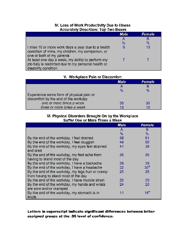 Summary of Key Findings Survey results suggest that a significant proportion of the American workforce feels disenfranchised and is working under circumstances that are less than healthy. • • Close to one in five American workers (18 percent) report company management doesn’t care about them. Close to one in five American workers (18 percent) report being too busy at work to take vacation time owed. One in five American workers (21 percent) report missing family events due to work, a problem more men (24 percent) face than women (17 percent). Close to one in five American workers (17 percent) report loss of sleep due to work, a condition that afflicts younger workers (23 percent) far more often than older workers (11 percent), who, in general, appear to be more adept at handling the pressures and demands of the workplace. Similar numbers of American workers also report having employers who make it difficult for them to attend medical appointments or to take care of medical emergencies. • • • Close to one in five American workers (17 percent) report management policies make it difficult for them to take time off or to leave work in emergency situations. Close to one in five American workers (19 percent) report the need to show up for work even if ill or injured. Close to one in five American workers (17 percent) report not feeling free to attend medical appointments during working hours, and when they do, two out of five (41 percent) report a loss in pay, which is even more typical (50 percent) for those on the lower-end of the pay scale. A significant minority of blue collar workers report working conditions that cause them to feel some physical pain or discomfort. • Overall, one-third of American workers (33 percent) report that, by the end of the workday, they experience some form of physical pain or discomfort one or more times per week, an occurrence more familiar to blue collar workers(46 percent) than to white collar workers (32 percent). – Reports of high risk of personal injury on the job are three-and-a-half times higher among blue collar workers (33 percent) than among white collar workers (9 percent). 5