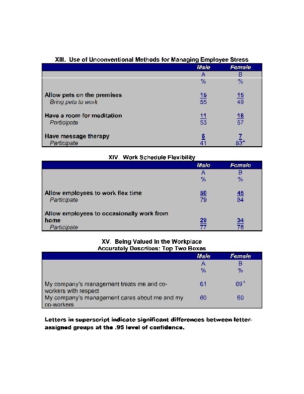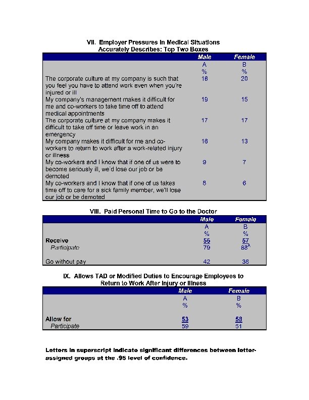 Men and women report very similar experiences in the workplace, though men are more likely to be at risk of injury in their jobs. XVI. Workplace Experiences: How They Differ for Men and Women Men are more likely than women to report: • a high risk of job-related injury; 2 times higher than women • the need to socialize with co-workers over drinks; 2 times higher than women • having to miss family activities due to work; 41 percent higher than women Women are more likely than men to report: • usage of paid personal time from work to attend medical appointments; 11 percent higher than men • • • respectful treatment from management; 13 percent higher than men an incidence of headaches at the end of their workday; 36 percent higher than men participation in employer-offered massage therapy; 2 times higher than men 23