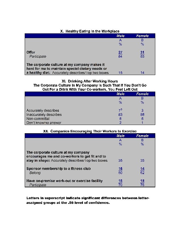 When available, most American workers choose healthy lunchhour food selections. X. Healthy Eating in the Workplace: Total Workers • Three in ten American workers report the availability of healthy foods at work; of those workers eighty-four percent choose to consume such food. Healthy lunch/ Offer dinner Participate in a healthy lunch/dinner The corporate culture at my company makes it hard for me to maintain special dietary needs or a healthy diet Accurately Describes 17