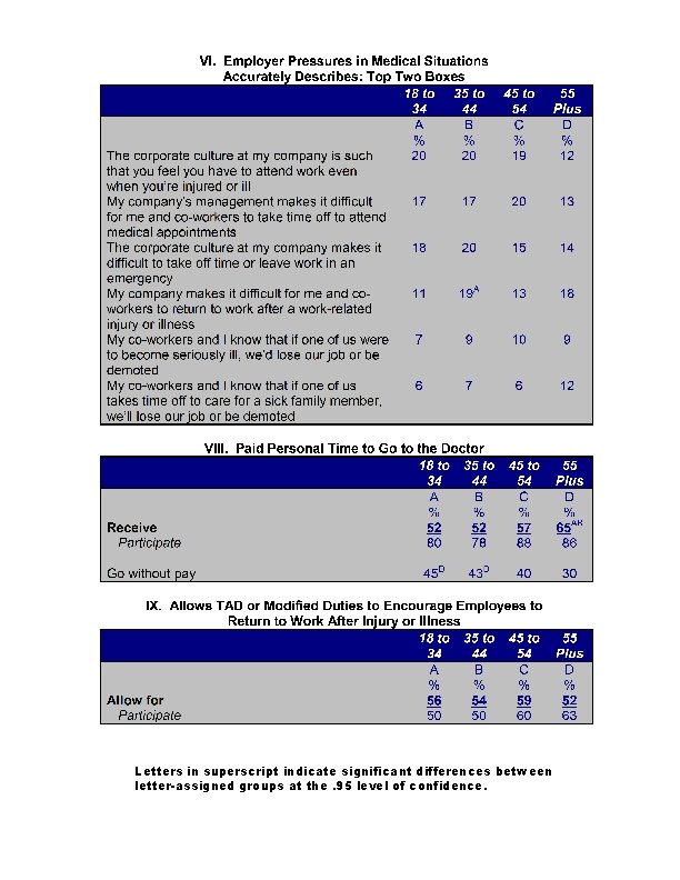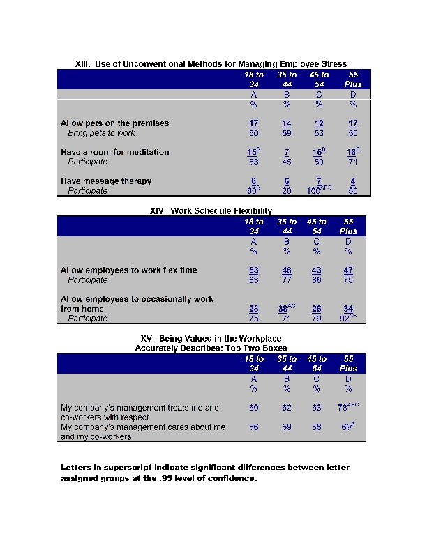 Younger workers (18 to 34) claim more mistreatment (perceived or real) on the part of management than older workers (55+). They also exhibit more job-related behavior that can lead to poor health. XVII. Workplace Experiences: How They Differ for Older and Younger Workers Relative to older workers, younger workers in their late teens to mid-30 s are more likely to report: • • a loss of sleep due to work; 2 times higher than workers age 50 or older eating lunch and working at the same time; 46 percent higher than workers age 50 or older work causing them to miss family activities; two times higher than workers age 50 or older going without pay to attend medical appoints; 50 percent higher than workers age 50 or older • not taking earned vacation days because of work demands; 80 percent higher than workers age 50 or older • • a high risk of injury on the job; two times higher than workers age 50 or older feeling physical pain or discomfort at the end of the workday; 67 percent higher than workers 50 or older In contrast to older workers, younger workers are less likely to report: • • management treats them with respect; 23 percent lower than workers age 50 or older management cares about them as individuals; 19 percent lower than workers age 50 or older 29