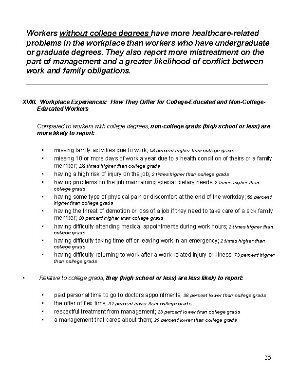 Workers without college degrees have more healthcare-related problems in the workplace than workers who have undergraduate or graduate degrees. They also report more mistreatment on the part of management and a greater likelihood of conflict between work and family obligations. XVIII. Workplace Experiences: How They Differ for College-Educated and Non-College. Educated Workers Compared to workers with college degrees, non-college grads (high school or less) are more likely to report: • • missing family activities due to work; 53 percent higher than college grads missing 10 or more days of work a year due to a health condition of theirs or a family member; 2½ times higher than college grads having a high risk of injury on the job; 2 times higher than college grads having problems on the job maintaining special dietary needs; 2 times higher than college grads • having some type of physical pain or discomfort at the end of the workday; 58 percent higher than college grads • • having the threat of demotion or loss of a job if they need to take care of a sick family member; 60 percent higher than college grads having difficulty attending medical appointments during work hours; 2 times higher than college grads • having difficulty taking time off or leaving work in an emergency; 2 times higher than college grads • having difficulty returning to work after a work-related injury or illness; 73 percent higher than college grads • Relative to college grads, they (high school or less) are less likely to report: • • paid personal time to go to doctors appointments; 38 percent lower than college grads the offer of flex time; 31 percent lower than college grads respectful treatment from management; 23 percent lower than college grads a management that cares about them; 20 percent lower than college grads 35
