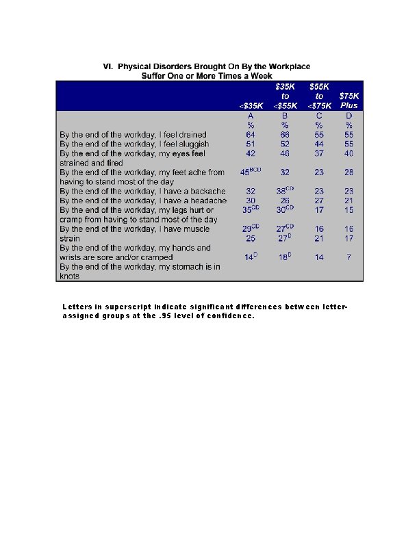 Exhaustion is a common complaint of American workers. VI. Those Who Suffer Physical Disorders Brought on by the Workplace: Total Workers • • • Six in ten American workers report that, at least one or more times a week, they end their workday feeling drained. One in two American workers report that, at least one or more times a week, they end their workday feeling sluggish. To a lesser extent: – two in five American workers report having eye strain and eye fatigue – one in three American workers report having foot pain from standing most of the day – one in four American workers report having back pain – one in four American workers report having headaches – one in four American workers report having leg cramps and soreness 13