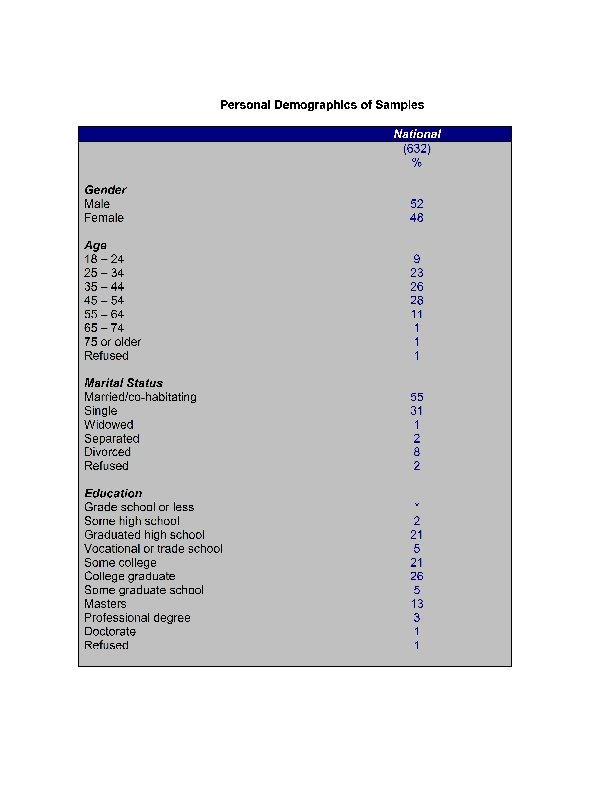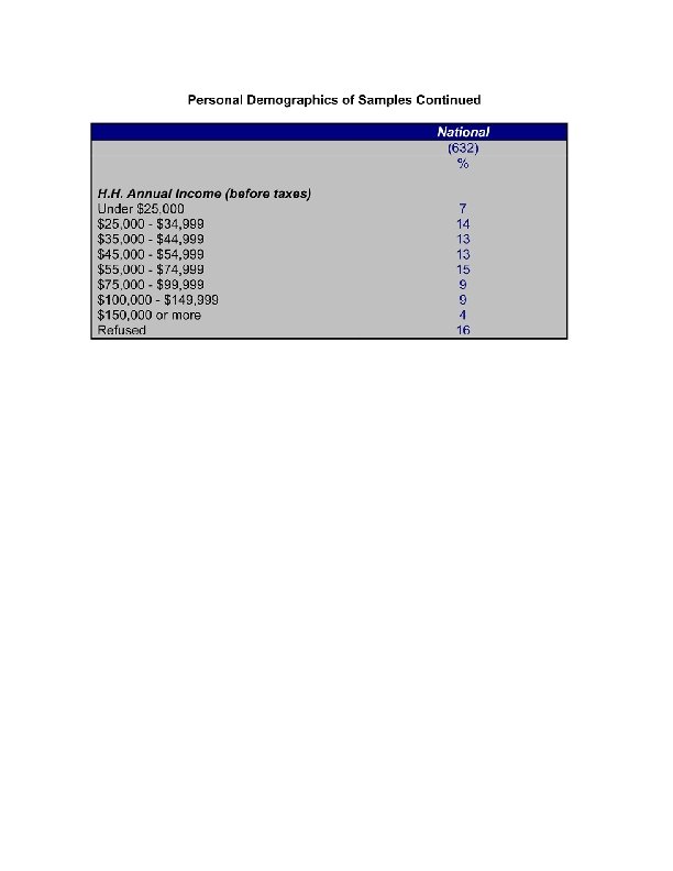 Reliability of Survey Percentages Results of any sample are subject to sampling variations. The magnitude of the variation is measurable and is affected by the number of interviews and the level of the percentages expressing the results. The table below shows the possible sample variation that applies to percentage results reported in this sample. The chances are 95 in 100 that a survey result does not vary, plus or minus, by more than the indicated number of percentage points from the result that would be obtained if interviews had been conducted with all persons in the universe represented by the sample. Approximate Sampling Tolerances Applicable to Percentages at or Near These Levels 57