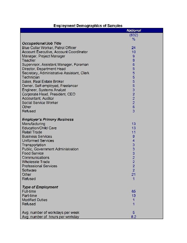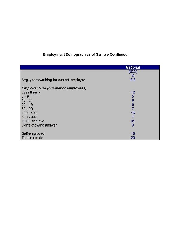 Introduction In late August 2000, Oxford Health Plans, Inc. , sponsored a nationwide survey. The goal of the survey was to determine how the modern-day work environment affects the health and quality of the lives of American workers. A related objective was to assess how the work environment supports employees’ wellness efforts. Survey results were independently collected and tabulated through Central Marketing, Inc. , of New York City. Magnet Communications of New York City, an agency working with Oxford Health Plans, had the responsibility of analyzing and articulating those results, which are the subject of this report. Methodology Results of this national study were obtained by contacting 632 working adults who consider themselves the head of their household. The working sample of 632 respondents was designed to ensure proper representation of telephone households by region and by metropolitan and nonmetropolitan areas. Interviews, which were conducted from August 17 through September 1, 2000, were administered by professionally-trained staff using the CATI (Computer Assisted Telephone Interview) system. The average interview was 15 minutes in length. Phone numbers were dialed electronically in a randomized sequence. For sample reliability information, refer to the Appendix of this report. 4