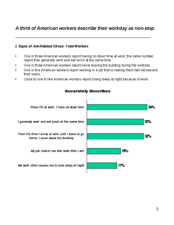 A third of American workers describe their workday as non-stop. I. Signs of Job-Related Stress: Total Workers • • One in three American workers report having no down time at work; the same number report they generally work and eat lunch at the same time. One in three American workers report never leaving the building during the workday. One in five American workers report working in a job that is making them feel old beyond their years. Close to one in five American workers report losing sleep at night because of work. 8
