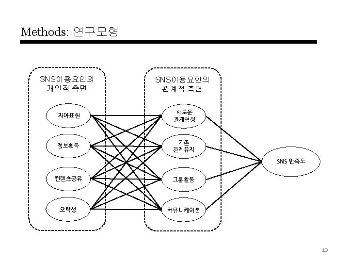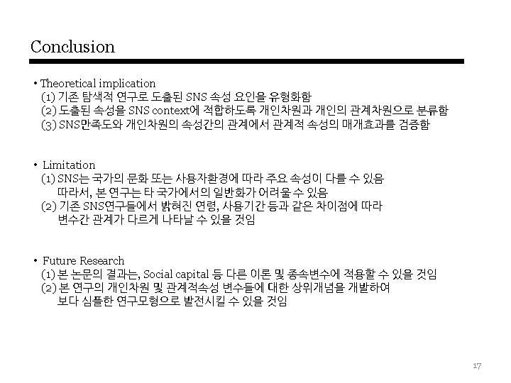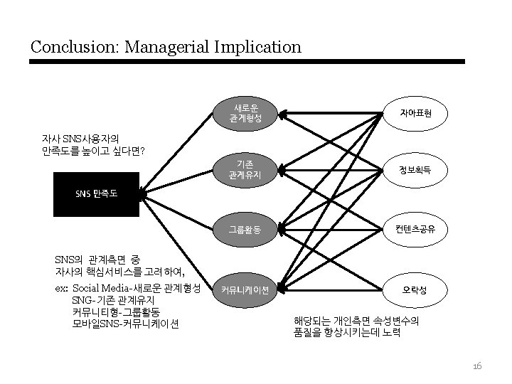 Results: 가설검증 자아표현 3. 416**(0. 228) 1. 729†(0. 114) 3. 320**(0. 207) 새로운 관계형성 R 2 =0. 294 2. 245*(0. 123) 6. 723**(0. 390) 정보획득 4. 531**(0. 243) 2. 465*(0. 145) 2. 989**(0. 196) 5. 591**(0. 314) 기존 관계유지 R 2 =0. 236 0. 051(0. 003) 5. 337**(0. 308) 컨텐츠공유 2. 239*(0. 142) 4. 339**(0. 299) 1. 878†(0. 107) SNS 만족도 1. 883†(0. 108) R 2 =0. 407 그룹활동 R 2 =0. 192 0. 049(0. 066) 1. 111(-0. 003) 오락성 1. 925†(0. 116) 4. 909**(0. 302) 커뮤니케이션 2. 804**(0. 192) R 2 =0. 337 (†: p < 0. 1, * : p < 0. 05, ** : p < 0. 01), 표기: T-statistics(Path coefficient) 15