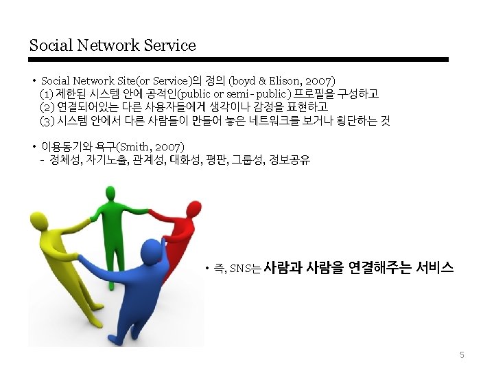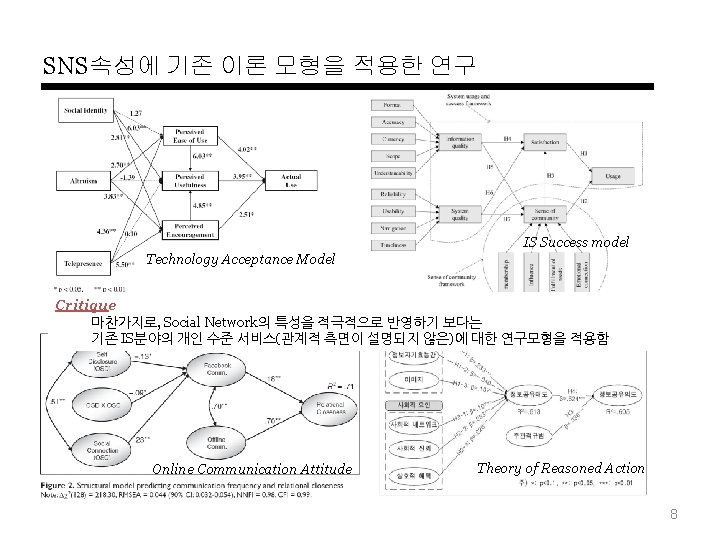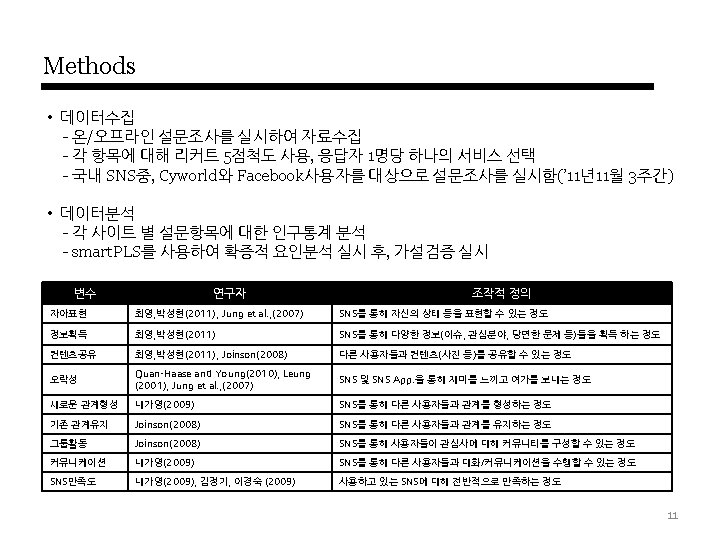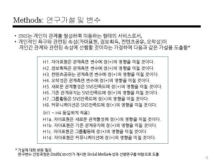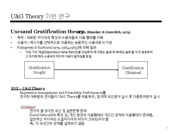 SNS-Motivation에 관한 연구 Theory 동기 요인 종속변수 Dunne et al. , (2010) Communication, Friending, Identity creation and management, Entertainment, Escapism and alleviation of boredom, Information search, Interacting with boys - Park et al. , (2009) Socializing, Entertainment, Self-status seeking, Information Civic / Political Participation Facebook group / 설문 Joinson(2008) Social connection, Shared identities, Photographs(Contents), Content gratifications, Social investigation, Social networking surfing, Status updates 사용(각 요인에 대한 방문수, 친 구수, 빈도 예측 ) Facebook / 설문 내가영(2010) 타인과의 커뮤니케이션, 관계형성의 유용성, 정보성, 외국에 대한 접근성, 유명인에 대한 접근성, 오프라인 과의 관련성, 이용의 용이함, 오락성, 단문성 만족감 트위터, 미투데이 / 설문 오승석(2010) 대인커뮤니케이션, 정보탐색, 엔터테인먼트, 자기확인 충족도 트위터, 페이스북 TRA 박현선(2010) 심리적요인(이타적 즐거움, 이미지) 사회적요인(사회적네트워크, 사회적 신뢰, 상호적 혜택 ) 정보공유의도 소셜미디어 / 설문 TAM Ohbyung Kwon, Yixing Wen(2009) social identity, altruism and telepresence Actual Use 소셜미디어 / 설문 Thelwall and Wilkinson(2010) making initial contact, keeping in touch occasionally, goship based social grooming - Myspace / 사용자(미국, 영국)의 dialog분석 Burke et al. (2009) social learning, singling out, feedback, and distribution. 신규가입자의 사진 update # Facebook / 사용자 log data U&G Theory 연구자 • SNS 모티베이션 관련 연구 User Data 기반 연구분야/데이터 Bebo / 12 -14세 여성 / 포커스그룹인터뷰 6