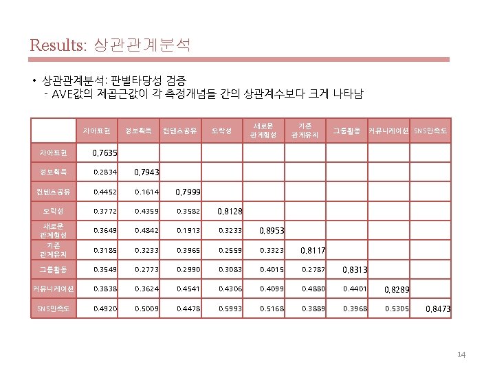 Results: 요인분석(타당성 및 신뢰성 검증)* 자아표현3 자아표현4 자아표현5 정보획득 1 정보획득 2 정보획득 3 정보획득 4 컨텐츠공유 1 컨텐츠공유 2 컨텐츠공유 3 컨텐츠공유 5 오락성 1 오락성 2 오락성 4 오락성 5 새로운관계형성 1 새로운관계형성 2 새로운관계형성 3 새로운관계형성 4 기존관계유지1 기존관계유지2 기존관계유지3 기존관계유지4 그룹활동 1 그룹활동 2 그룹활동 3 커뮤니케이션 1 커뮤니케이션 2 커뮤니케이션 3 커뮤니케이션 4 만족도1 만족도2 만족도3 만족도4 만족도5 0. 7281 0. 7992 0. 7613 0. 2560 0. 1753 0. 1523 0. 3068 0. 3876 0. 3107 0. 3322 0. 3879 0. 2850 0. 3025 0. 3441 0. 3007 0. 3242 0. 3082 0. 3390 0. 3345 0. 2594 0. 1936 0. 2926 0. 2931 0. 3208 0. 2974 0. 2633 0. 3409 0. 2893 0. 3047 0. 3330 0. 4119 0. 4258 0. 3979 0. 4135 0. 4318 정보획득 0. 2347 0. 1444 0. 2747 0. 8379 0. 8184 0. 7500 0. 7677 0. 0584 0. 2151 0. 0825 0. 1607 0. 3960 0. 4335 0. 3087 0. 2614 0. 4129 0. 4138 0. 4351 0. 4699 0. 2708 0. 2813 0. 2605 0. 2347 0. 2682 0. 2316 0. 1863 0. 2924 0. 3554 0. 2769 0. 2840 0. 4412 0. 4460 0. 3956 0. 3867 0. 4483 컨텐츠 공유 0. 2511 0. 4413 0. 3169 0. 0658 0. 0511 0. 0869 0. 2957 0. 7603 0. 7618 0. 8422 0. 8315 0. 2745 0. 2964 0. 3028 0. 2951 0. 1737 0. 1386 0. 1885 0. 1829 0. 3392 0. 3722 0. 3210 0. 2467 0. 1964 0. 2938 0. 2606 0. 3986 0. 3121 0. 3941 0. 3939 0. 3144 0. 3304 0. 4024 0. 4791 0. 3690 오락성 0. 2484 0. 3064 0. 3059 0. 3550 0. 3346 0. 3297 0. 3617 0. 2853 0. 2911 0. 2782 0. 2922 0. 8523 0. 8628 0. 7630 0. 7675 0. 2897 0. 2683 0. 3013 0. 2977 0. 1746 0. 2209 0. 2549 0. 1741 0. 3056 0. 2062 0. 2527 0. 3967 0. 3224 0. 2967 0. 4019 0. 4946 0. 4988 0. 4827 0. 5642 0. 4950 * 요인 적재값(0. 7이상), AVE값(0. 5이상), C. R. (0. 7이상) 새로운 관계형성 0. 3015 0. 2454 0. 2931 0. 3736 0. 4297 0. 4123 0. 3269 0. 1386 0. 1885 0. 1133 0. 1714 0. 2988 0. 3116 0. 2640 0. 1636 0. 8811 0. 8419 0. 9293 0. 9258 0. 2405 0. 2701 0. 2351 0. 3426 0. 4081 0. 3201 0. 2633 0. 3500 0. 3813 0. 2975 0. 3338 0. 4880 0. 4752 0. 3636 0. 3806 0. 4747 기존 관계유지 0. 1677 0. 2473 0. 3085 0. 2714 0. 1881 0. 2054 0. 3511 0. 2856 0. 2548 0. 3385 0. 3778 0. 2226 0. 2455 0. 1912 0. 1655 0. 2998 0. 2874 0. 2837 0. 3182 0. 8582 0. 8270 0. 8120 0. 7452 0. 2369 0. 2299 0. 2276 0. 3690 0. 4119 0. 4188 0. 4210 0. 2705 0. 3254 0. 3867 0. 3837 0. 2858 그룹활동 0. 3138 0. 2446 0. 2602 0. 2697 0. 2679 0. 1916 0. 1551 0. 2575 0. 1788 0. 2043 0. 3036 0. 2927 0. 2684 0. 2476 0. 1862 0. 3060 0. 3683 0. 3774 0. 3842 0. 1912 0. 2686 0. 2040 0. 2423 0. 8424 0. 8784 0. 7695 0. 4462 0. 3629 0. 2573 0. 3843 0. 3601 0. 3254 0. 2593 0. 3051 0. 4195 커뮤니케이션 0. 2195 0. 3979 0. 2526 0. 2695 0. 1842 0. 2957 0. 3898 0. 3576 0. 3695 0. 3610 0. 3664 0. 3230 0. 3588 0. 3124 0. 4137 0. 3626 0. 3629 0. 3729 0. 3691 0. 4311 0. 4327 0. 3921 0. 3214 0. 2572 0. 3275 0. 5306 0. 8297 0. 8190 0. 8172 0. 8491 0. 4176 0. 3767 0. 4633 0. 5130 0. 4714 SNS만족도 0. 3350 0. 3852 0. 4041 0. 4137 0. 3528 0. 3926 0. 4257 0. 3616 0. 3283 0. 3512 0. 3870 0. 5297 0. 5487 0. 4275 0. 4309 0. 4598 0. 4682 0. 4572 0. 4653 0. 2858 0. 3149 0. 3546 0. 3044 0. 3587 0. 3151 0. 3126 0. 4555 0. 3771 0. 4263 0. 4898 0. 8052 0. 8682 0. 8472 0. 8770 0. 8367 Composite Reliability 0. 5829 0. 8072 AVE 0. 6309 0. 8722 0. 6398 0. 8764 0. 6606 0. 8858 0. 8015 0. 9416 0. 6588 0. 8851 0. 6911 0. 8700 0. 6870 0. 8977 0. 7179 0. 9271 13