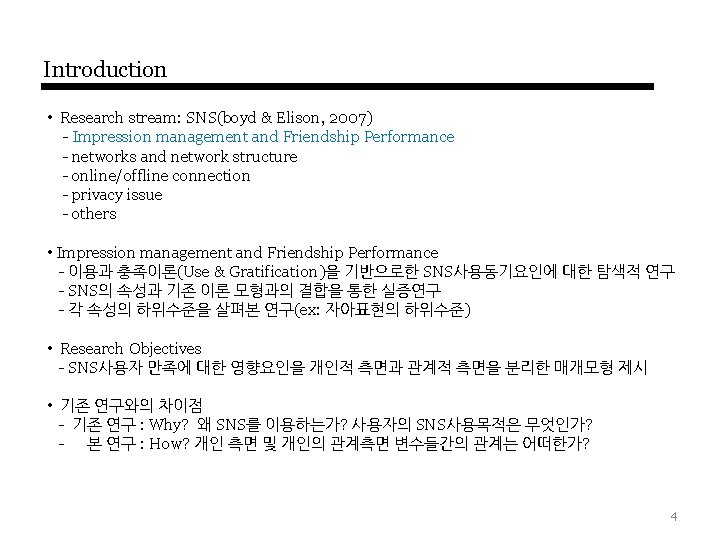 Introduction APPS 앱스토어 소셜 소셜 네트워킹 관련 APPS 안드로이드마켓 컨텐츠 관련 8220 개 544개 Social Networking Sites, Social Networking Game, Social Media, Social Commerce…. Social Network 기반 서비스 시장확대 및 다양화 3