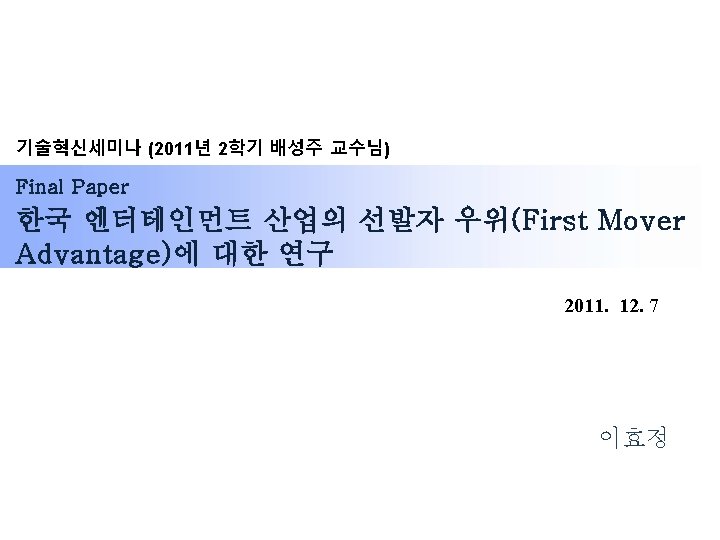 III. Research Model & Hypotheses 시장 불확실성 (박진수, 2010) 기존의 타성 (박진수, 2010) 간접적 경험과 기존 자원 보유 (D’Aveni, 1994) 낮은 진입장벽과 새로운 시장 환경 의 급격한 변화 (이상명 et al 2008) Market Uncertainty Learning Failure Targeting Weak Spot of Value Chain Use of network in industry H 1: Market Uncertainty will be negatively related to the first mover advantage effect of Korean entertainment firm. H 1 (-) First Mover Advantage H 2 (-) H 3 (+) Second Mover Advantage H 4 (+) H 2: Learning Failure will be negatively related to the first mover advantage effect of Korean entertainment firm. H 3: Targeting weak spot of entertainment industry value chain will positively to the second mover advantage effect of Korean entertainment firm. H 4: The use of network in entertainment industry will positively to the second mover advantage effect of Korean entertainment firm. 10