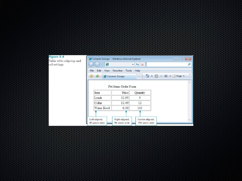Table Grouping Attributes The primary use of the grouping elements is to let you apply styles to groups of either rows or columns
