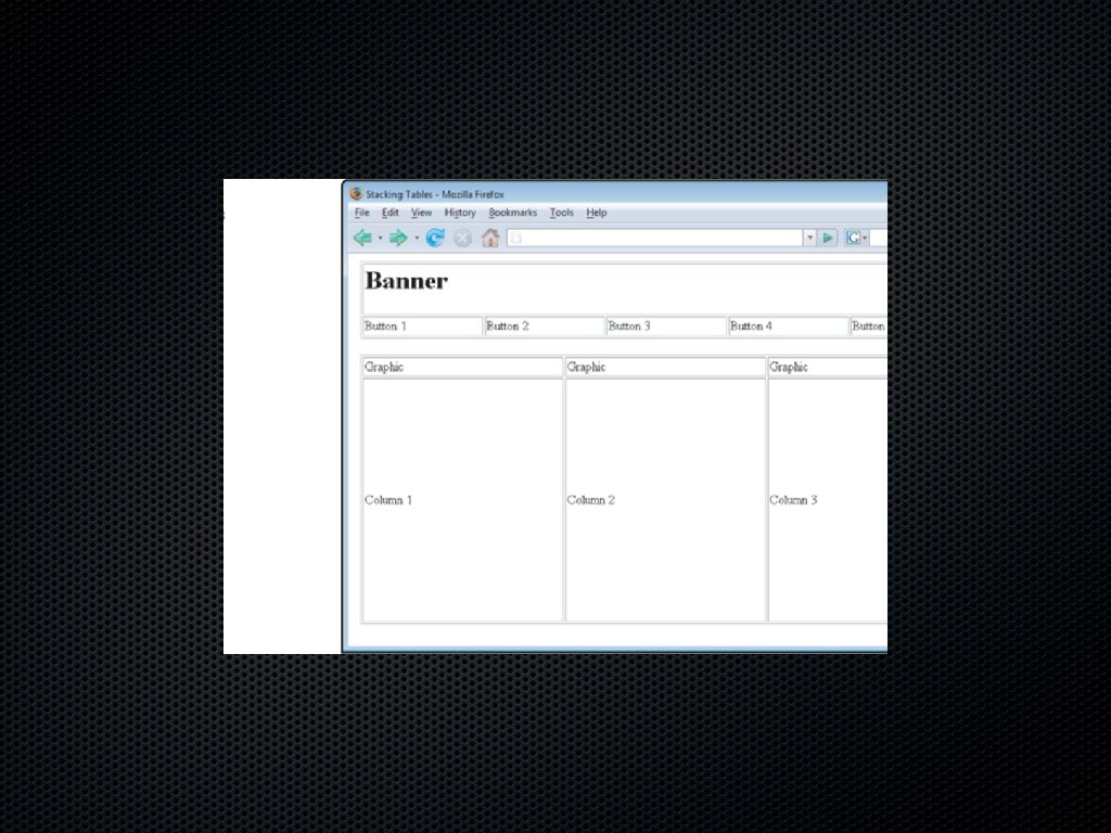 Stacking Tables Because of the way browsers display tables, it is better to build several small tables rather than one large one This technique, called stacking tables, also can simplify your table design task, because smaller tables are easier to work with