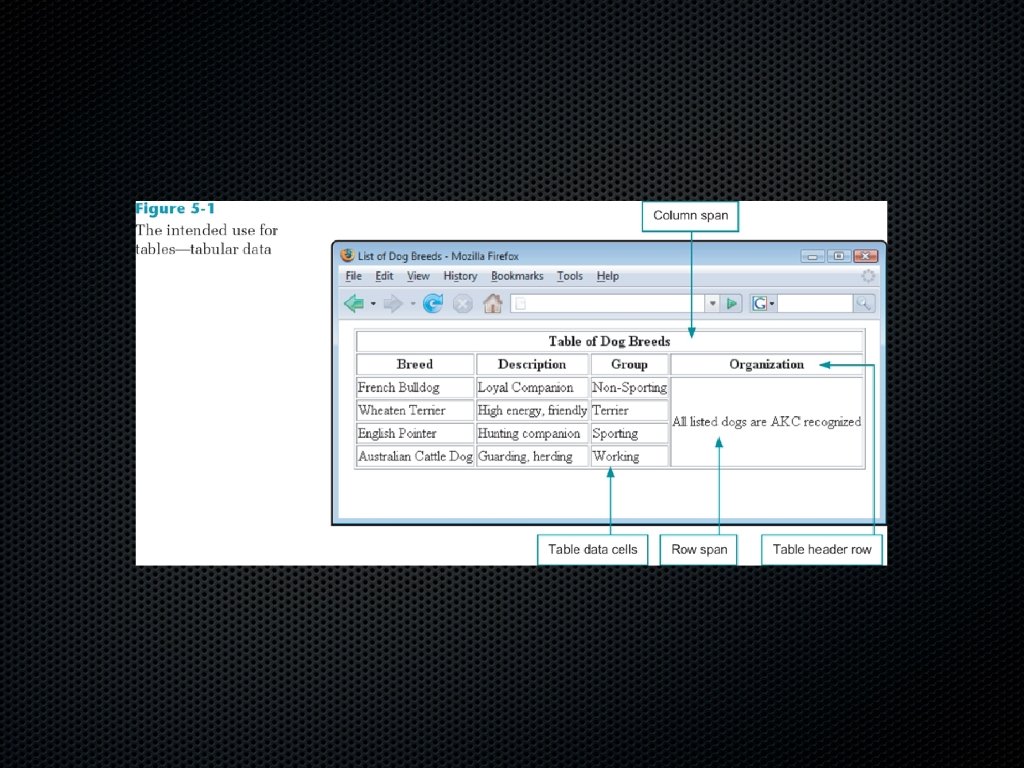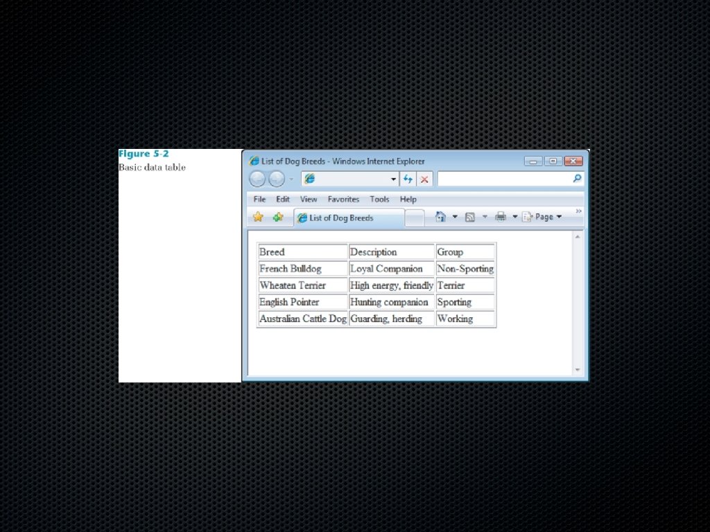 Basic Table Code <table border="1“> <tr><td>Breed</td><td>Description</td><td>Group</td> </tr> <tr><td>French Bulldog</td><td>Loyal Companion</td> <td>Non-Sporting</td></tr> <tr><td>Wheaten Terrier</td><td>High energy, friendly</td> <td>Terrier</td></tr> <tr><td>English Pointer</td><td>Hunting companion</td> <td>Sporting</td></tr> <tr><td>Australian Cattle Dog</td><td>Guarding, herding</td> <td>Working</td></tr> </table>