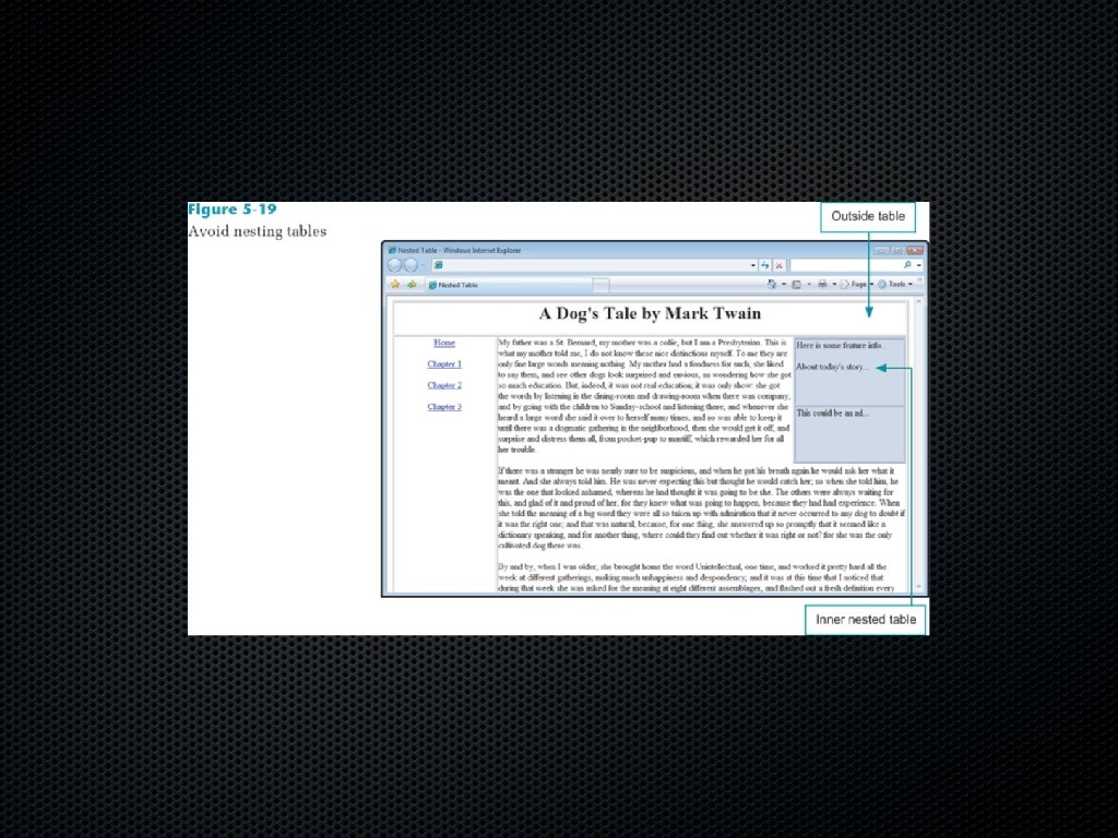 Summary Plan your tables by sketching them out first Use fixed table widths if you want to determine the size of your page rather than let the browser determine the width Use relative widths if you want to build tables that resize with the browser window, wrapping your content to fit Write table code that is easy to read, remove extra spaces, and choose whether to center or stack tables Avoid using nested tables and use CSS whenever possible to add presentation style to tables