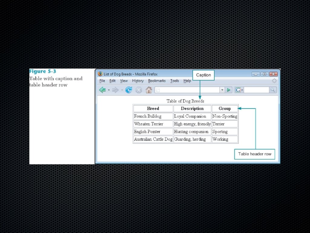 Caption and Table Header <caption> lets you add a caption to the top or bottom of the table By default, captions display at the top of the table; you can use the align=“bottom” attribute to align the caption at the bottom of the table The <th> tag lets you create a table header cell that presents the cell content as bold and centered