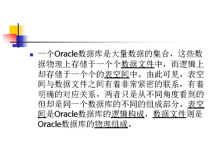 n n n (2)如果需要查询表空间edu对应的数据文件, 应该使用dba_data__files数据字典。 SQL>SELECT file name FROM dba_data_files WHERE tablespace_name=‘EDU’; dba_data_files返回结果将不包括临时表空间 的数据文件,临时文件信息只能从 dba_tempfiles中查询得到,如下所示: SQL>SELECT file_name FROM dba_temp_files;