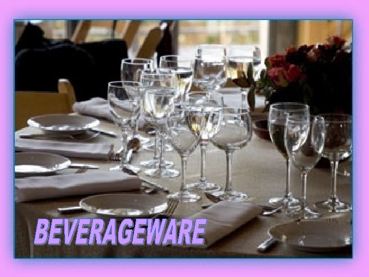 Every brand of beverageware will vary A - Brandy Snifter slightly in design. B - Champagne Flute C - Sherry / Port The glassware here is a “cut crystal”. D - Red Wine The surface of the glass is cut into E - Cordial various designs that reflect light and add F - Water beauty. G - White Wine