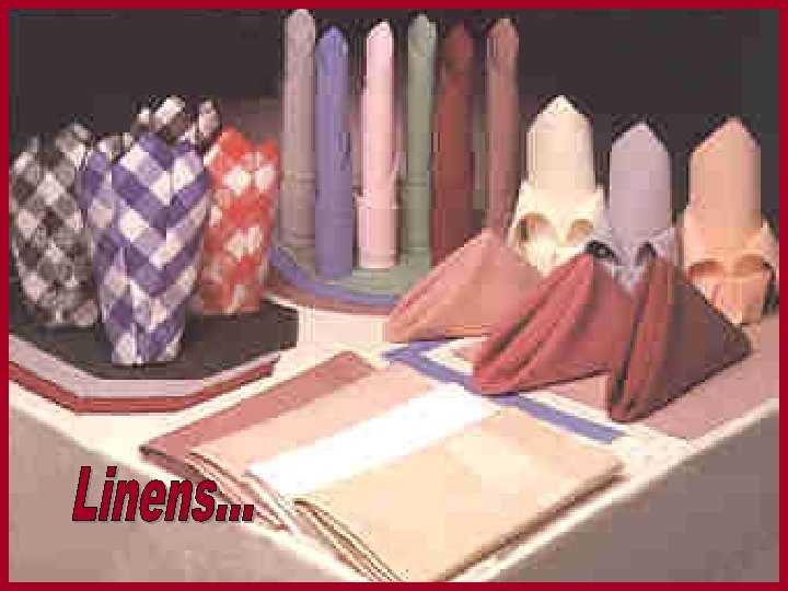 Table napkins are used for wiping hands, wiping the mouth, and protecting clothing when eating. The fabric must be absorbent. Napkins can match or complement other table linens. Most napkin folds require a material Standard napkin sizes: that will hold a crease, usually cotton or linen fabric, Cocktail – 10” square that can be starched and ironed. Plain colors are best, Luncheon – 17” square although some patterns look nice in a fold. Dinner – 20 -22” square Napkin rings offer The napkin must be an alternative to perfectly square for decorative folds. most folds to work well.