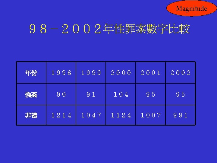 Magnitude National survey statistics Physical assault: • • Philippines USA Canada Egypt Sexual Assault: 10% 22% 29% 34% • Toronto • London HKSAR? 15% 23%