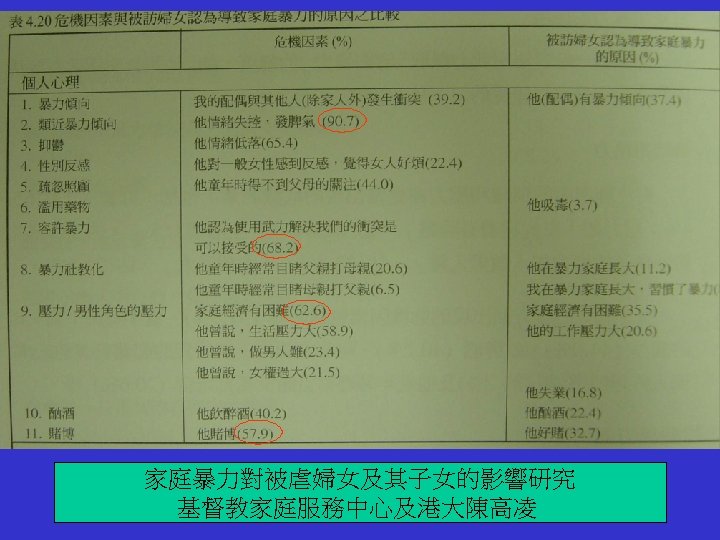 Effect on abused women • 57% have 6 negative answers to the general health questionnaire 家庭暴力對被虐婦女及其子女的影響研究 基督教家庭服務中心及港大陳高凌