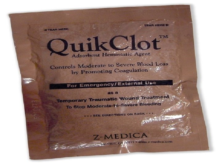 Tactical Field Care • Bleeding cont’d • Significant bleeding should be controlled using a tourniquet as described previously. • Once the tactical situation permits, consideration should be given to loosening the tourniquet and using direct pressure or hemostatic dressings (Hem. Con®) or hemostatic powder (Quik. Clot®) to control any additional hemorrhage