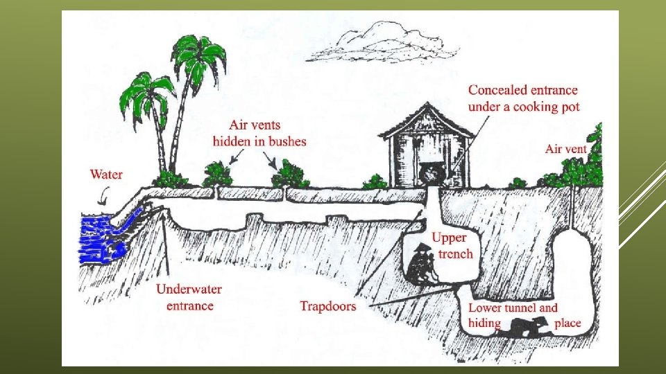 Uses: hiding spots during combat, served as communication and supply routes, hospitals, food and weapon caches and living quarters for numerous North Vietnamese fighters. Despite trying to eliminate the tunnels, the Americans were generally unsuccessful. On occasions when troops found a tunnel, they would often underestimate its size. Rarely would anyone be sent in to search the tunnels, as it was so hazardous. The tunnels were often rigged with explosive booby traps or punji stake pits. TUNNELS
