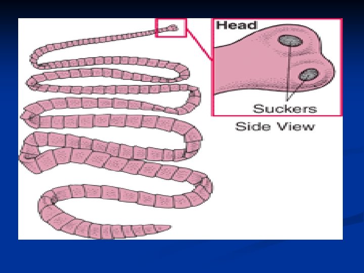 Morphology: n Adult habitat is in the middle third of small intestine. n T. saginata can be up to 4 - 6 meters long or sometimes up to 24 meters and 12 mm broad. n It has a pear-shaped head (scolex) with four suckers and a single apical depression, but no hooks. n It has a long flat body with 1000 -2000 segments (proglottids), of them 1/3 -1/2 are nearly gravid.